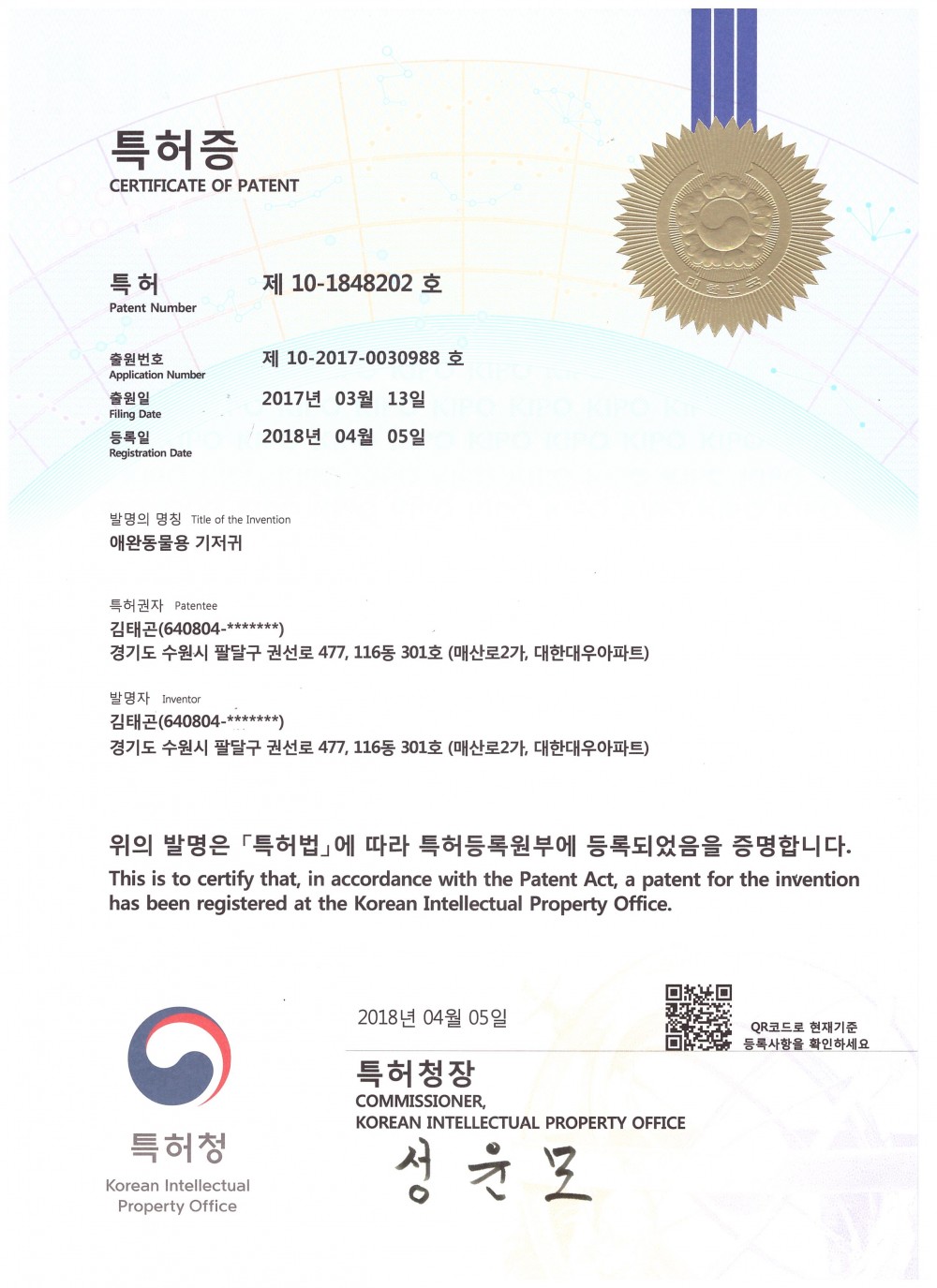 일자형 리필 애견기저귀 특허증